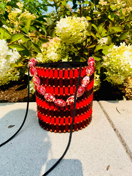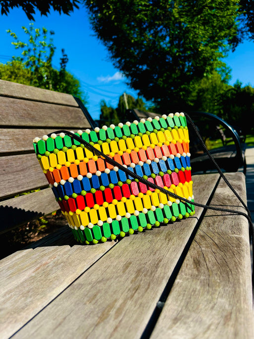 The Akouvi Handbag handcrafted made is a beautiful multicolored handbag blend of beads and wood, showcasing the rich natural craftsmanship of Togo....