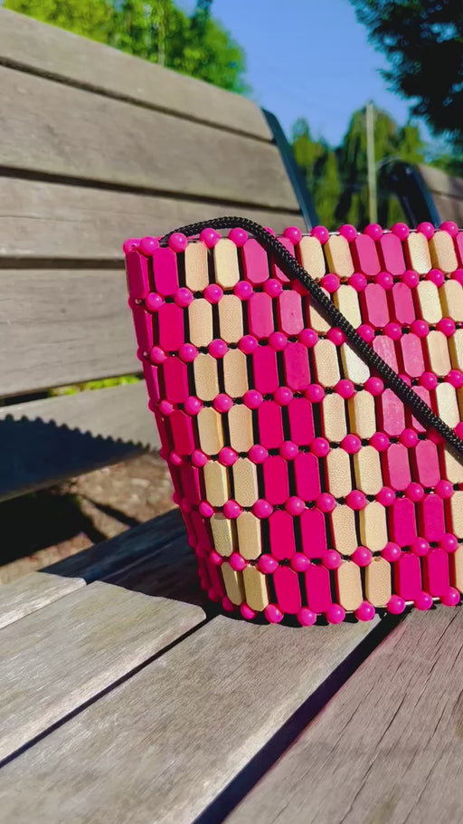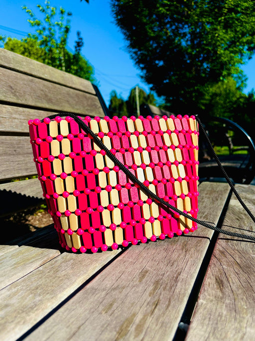 The Akouvi Handbag handcrafted made is a beautiful pink handbag blend of beads and wood, showcasing the rich natural craftsmanship of Togo. The des...